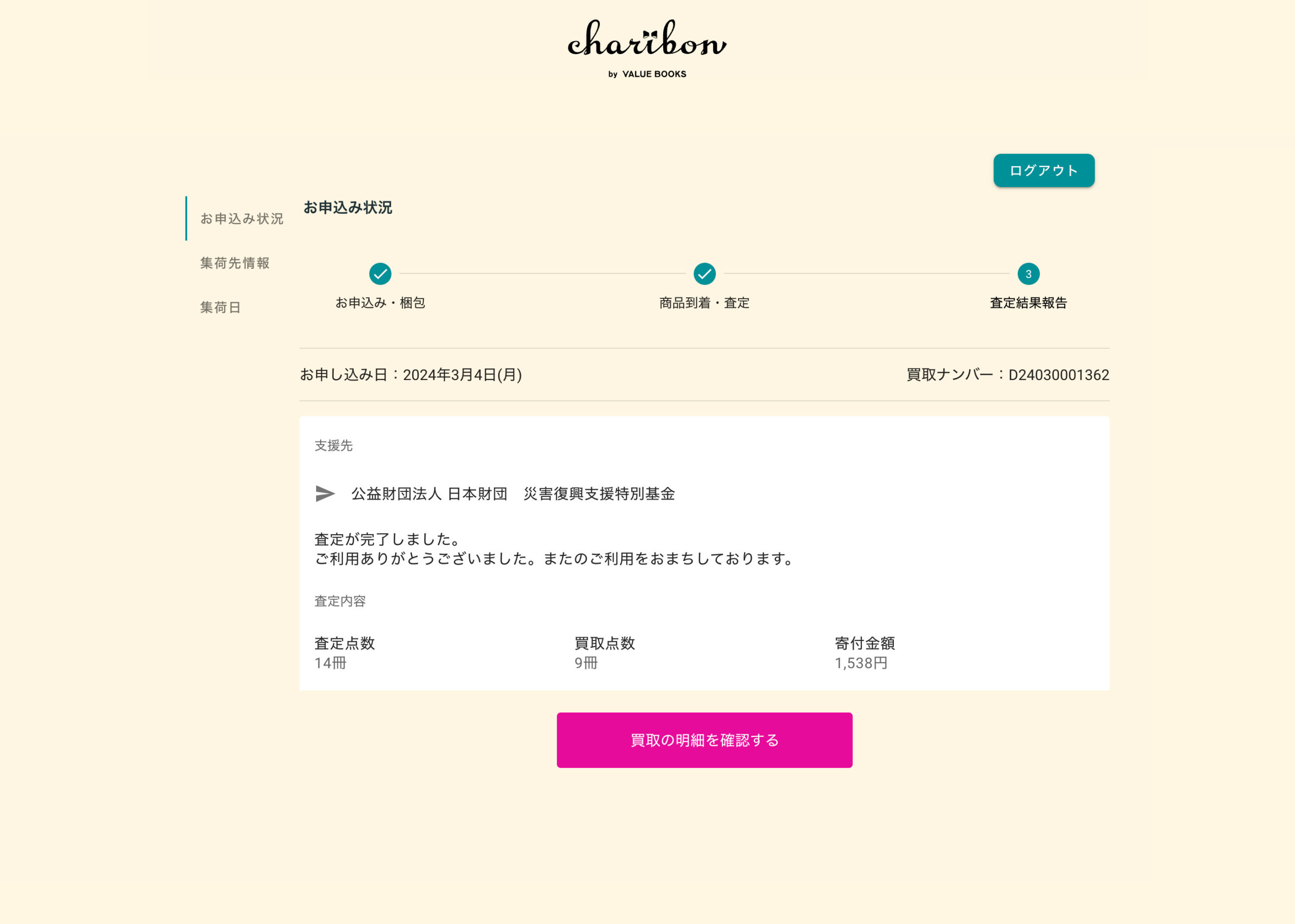 昨年も行った本・CD・DVDで寄付できるcharibonを利用して、公益財団法人 日本財団 災害復興支援特別基金へ寄付しました。